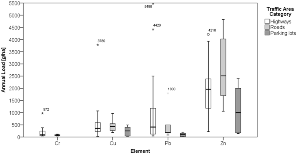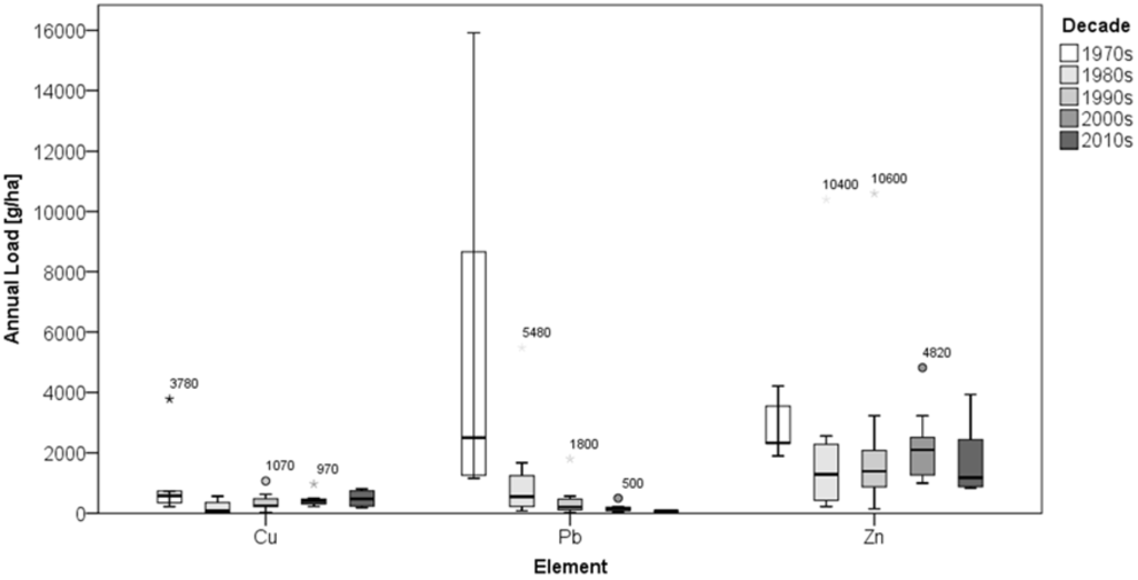 The historical trends of traffic area runoff loads published in literature were analyzed for Cu, Pb, and Zn from the 1970s to date. The loads were aggregated into five decades and plotted as box and whisker plots in Figure 2.