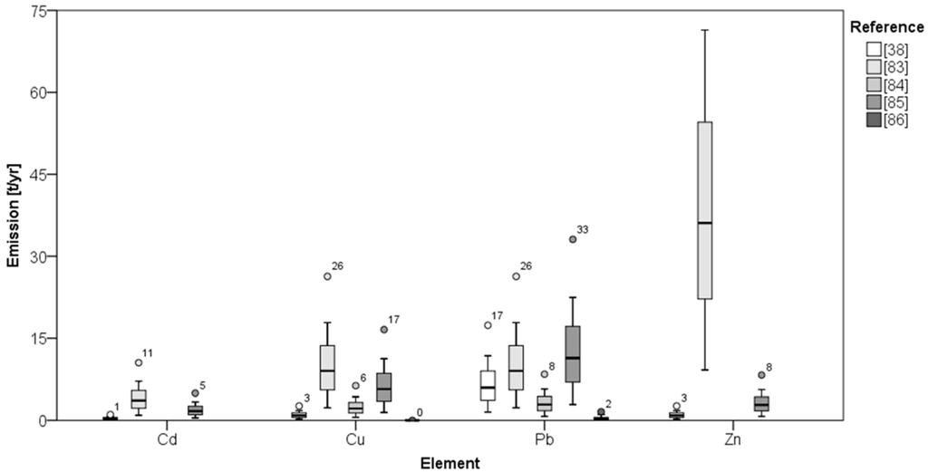 The total emissions are influenced by the highly variable annual consumption in Germany (0.46–5.26 million tons per year for the years 1990–2013). The metal contents of Cd, Cu, Pb, and Zn published in five references were multiplied by the annual consumption values in Germany for the years 1990–2013 (Table 8 and Figure 3). Each box and whisker represents the annual variation of the heavy metal emissions by de-icing salts for one element and the metal content of the corresponding reference. Thus, the mean de-icing salt emissions presented in Table 7 can only be a very rough estimation. In contrast to the other traffic related emission sources, the variability of these emissions mainly depends on climatic factors.
