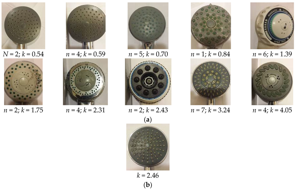 The feedback from 37 volunteers (from 10 families) on showering attributes in their respective residential washrooms (i.e., 10 different washrooms) were studied. Figure 1 exhibits the 10 showerheads under investigation, where n is the number of users, k is the showerhead resistance factor (kPa·min2·L−2) that ranges from 0.54 to 4.05 (p ≤ 0.05, t-test) expressed by the equation below for the showerhead discharge characteristics.