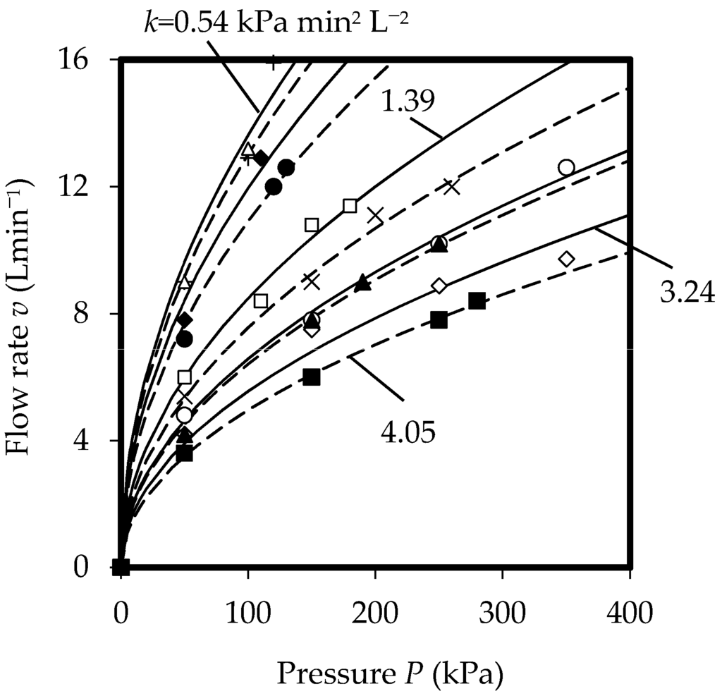 Figure 2 shows the flow rate v (L·min−1) against water supply pressure P (kPa) for the 10 showerheads surveyed.