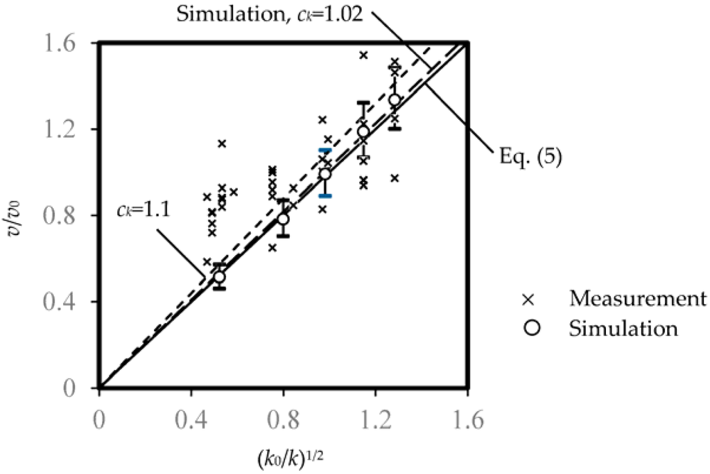 As there were variations in usage patterns associated with the newly installed WELS showerhead, the amount of water saved could be less significant. The measured and predicted values of v/v0 for the 10 surveyed washrooms against (k0/k)1/2 are plotted in Figure 4. Average prediction with error bars are shown for reference. Equation (5) is shown for the water saving due to the resistance factor. A regression line shows that prediction and measurement of water use can be correlated using a constant ck (p < 0.01, t-test):