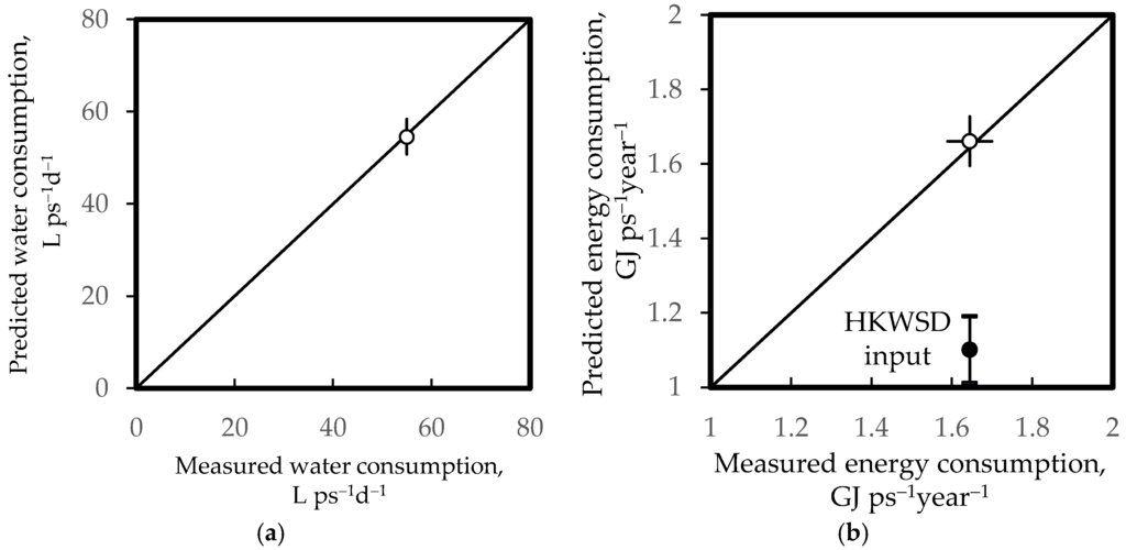 In addition, the annual amount of domestic hot water energy consumed (water used in cooking excluded) in Hong Kong reported by HKEMSD was taken as a reference (i.e., 1.645 GJ ps−1·year−1) [1]. Based on the data from HKWSD, the predicted energy consumption for September to May is 1.1 GJ·ps−1·year−1 (sd = 0.09 GJ ps−1·year−1), 30% below the HKEMSD reference value and the reference line for the energy consumption. Based on the year-round showering patterns of Hong Kong residents from open literature data [6,14], the predicted energy consumption is 1.66 GJ·ps−1·year−1; and as shown in Figure 5b, it is 1% higher than the HKEMSD reference.