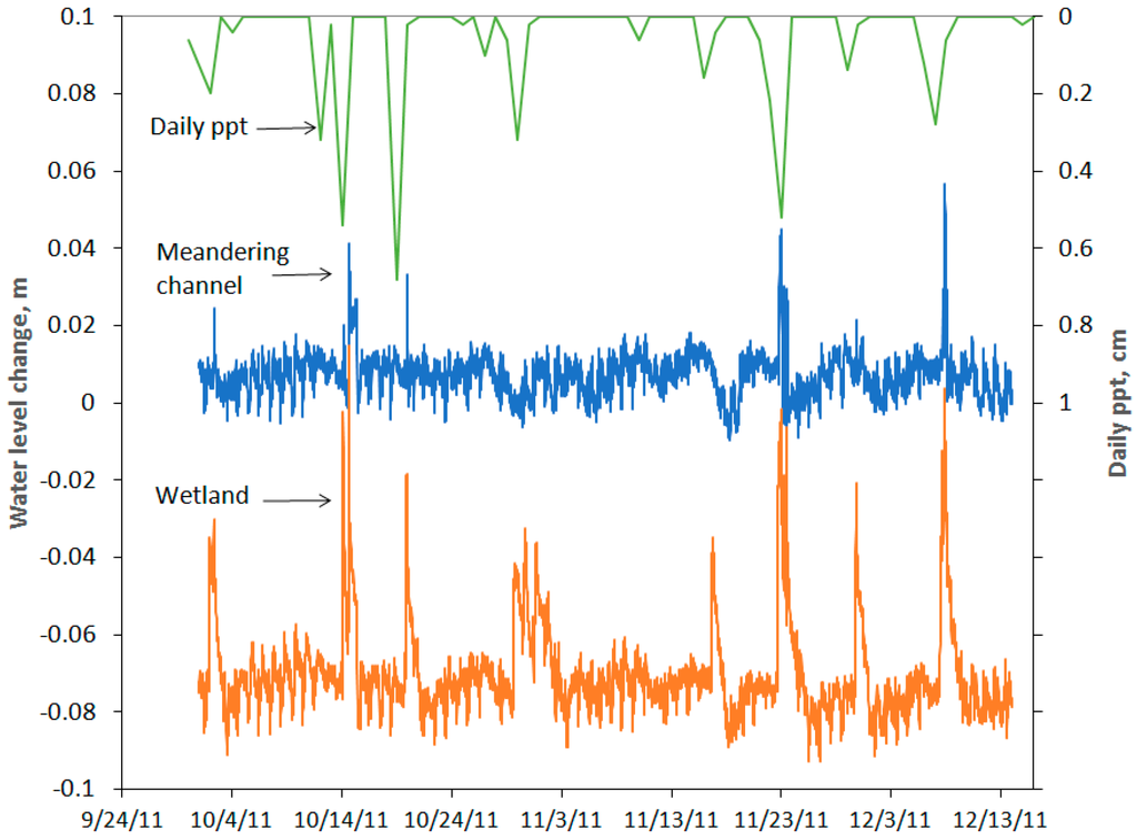 Comparison of stormwater overflow shown as spikes in water level in two retention basins: one with a meandering channel and one with a wetland. The baseline for the wetland was shifted down 0.08 m to show responses on the same plot.