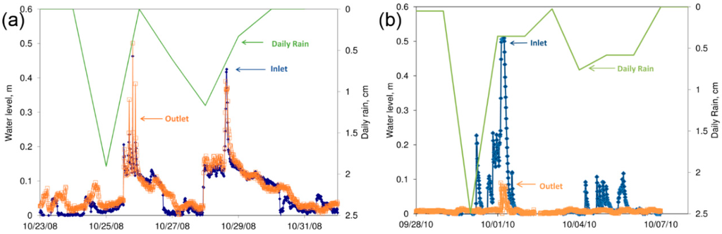 Water level loggers were placed in the inlet and outlet structures before and after retrofitting. The inlet and outlet were monitored for three months (August–October) before the retrofit. Monitoring resumed after the retrofit for eight months (from May to December). The shortened pre-monitoring period was due to the limited time before the anticipated construction schedule. A longer monitoring period post-construction was used to overlap seasons with the pre-monitoring period and to confirm the observed change in response over multiple seasons. Typically, 1 cm of daily rain was needed for an observed increase in water level. Pre-construction, 20 storms greater than 1 cm of daily rain were observed; post-construction, 30 storms greater than 1 cm were observed.