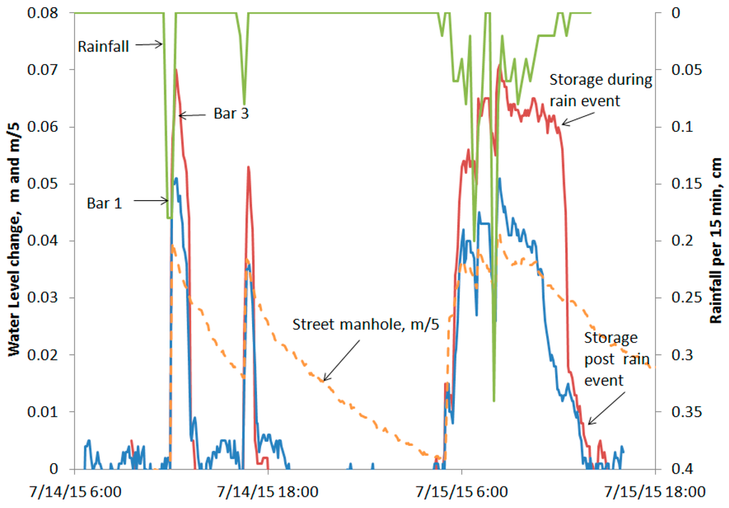 Monitoring was conducted with water level loggers to answer questions about the effectiveness of various SCMs. Onset HOBO pressure transducers (4 m range, 0.3 cm accuracy) were used to measure water level. One to three water level loggers were installed, and data were collected at 15 min intervals. Water level loggers were installed in pairs to evaluate the timing and size of storm responses. An additional barometric logger was also needed to correct water level data for changes in barometric pressure. Rain data were obtained from nearby weather stations that report online or a rain gauge was installed on site. A monitoring system that included three loggers, software, computer connectors, and a rain gauge cost only $1,750 using the Onset HOBO water level logger ($300 each) and rain gauge ($420 each). Nearby sites could share rain gauges and barometric loggers. The water level loggers also include a temperature sensor, which sometimes provided additional information on stormflow. Labor costs were not included in the monitoring budget, and they can be highly variable depending on the number of sites, location, and frequency and duration of downloading data. However, relatively little training is needed to download and process the data (undergraduate students performed the field work in most of the projects described here.)