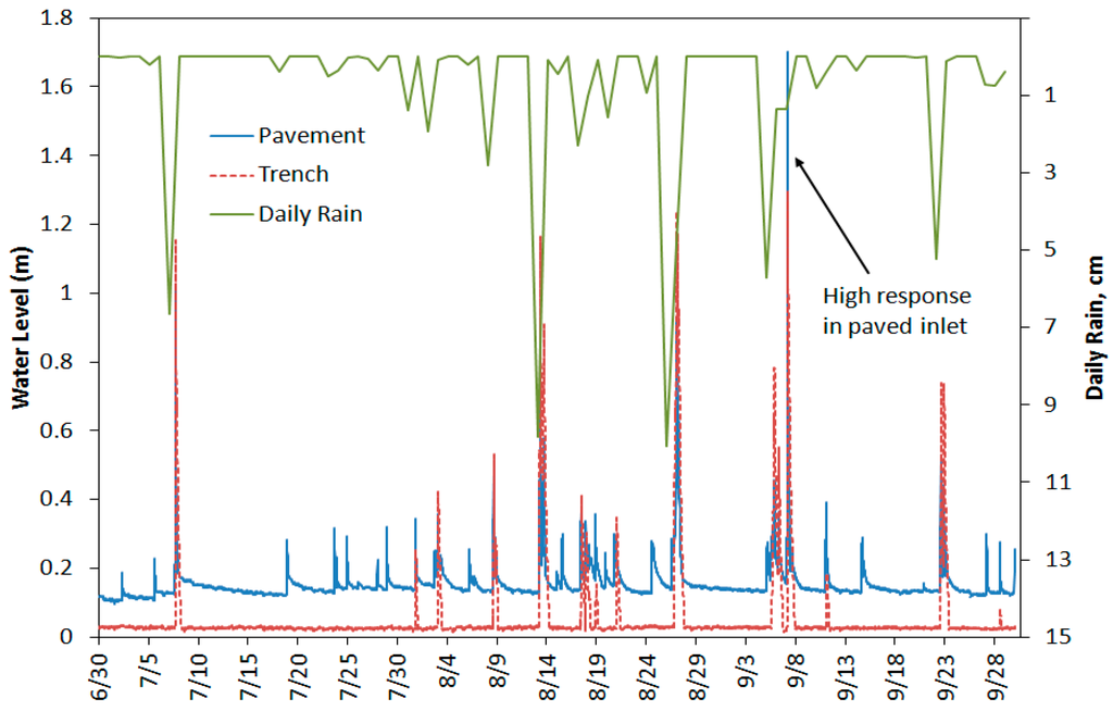 Water level response in parking lot infiltration trench and traditional storm pipe with a paved inlet. On 8 September 2011, the paved pipe had a higher response (see detail in Figure 6).
