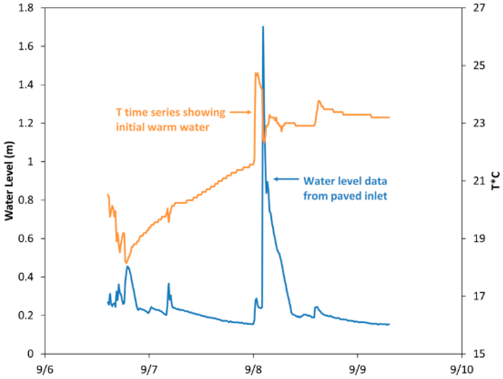 Higher response in the pipe beneath the pavement was linked to flow reversals. The water showed a temperature increase when the water level response was higher. For a storm on 8 September 2011, the warmer water appeared at 1:00 A.M.; however, warmer water is not expected for a night time rain event (Figure 6). Stormwater stored in the street stormpipe may have been warmed and entered the parking lot during this and similar storm events. Higher-cost monitoring using a flowmeter was used to follow up this observation. This flowmeter monitoring confirmed that flow sometimes reverses direction, moving water from the street to the parking lot.