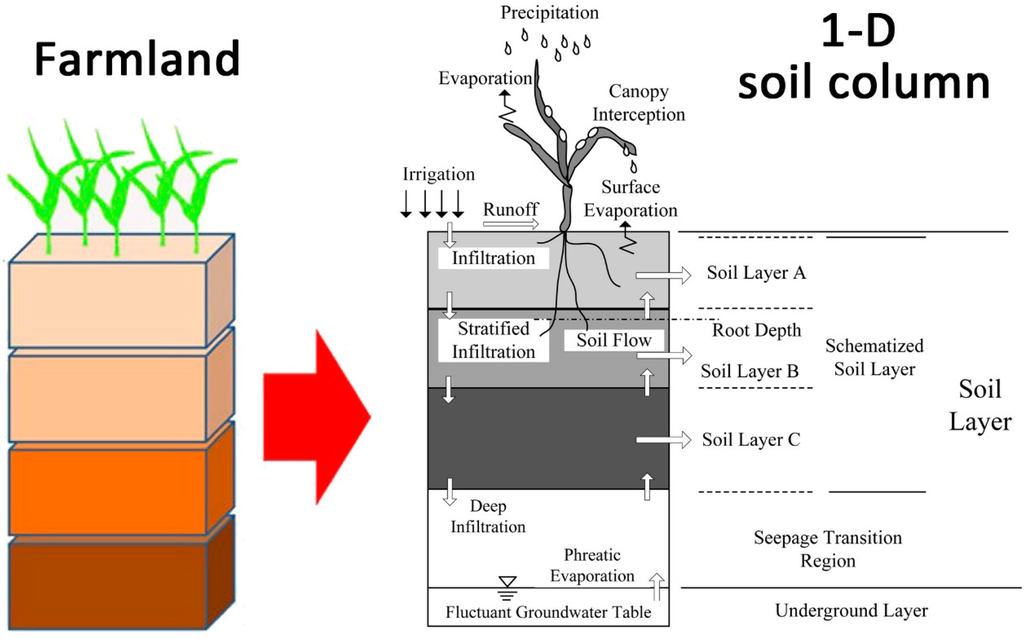 The soil water transformation efficiency refers to the ratio between the effective soil water recharged in the root zone and the total volume of the other types of water (e.g., precipitation, irrigation water, and phreatic water) that can be transformed into soil water: