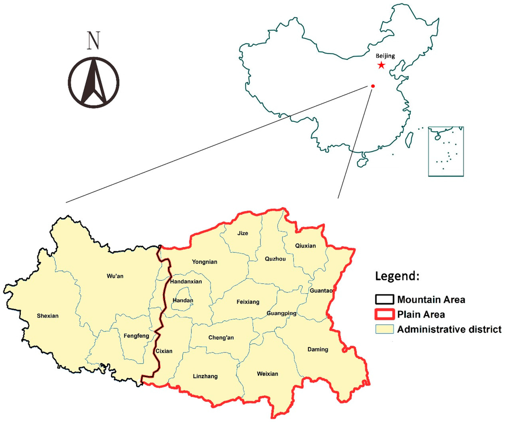 Handan City has a long history of agricultural cultivation and is one of the most important grain and cotton production areas in the North China Plain. According to the Year Book of Agricultural Statistics, the annual grain production in Handan City was above 4.5 × 109 kg from 2005 to 2012, ranking in the top three areas in Hebei Province. Winter wheat, cotton, and summer maize are the dominant crops. The average farmland area in this region in the past decade reached 660,000 ha, accounting for almost 10% of the total arable land in Hebei Province. For these reasons, Handan City was selected as the study area.