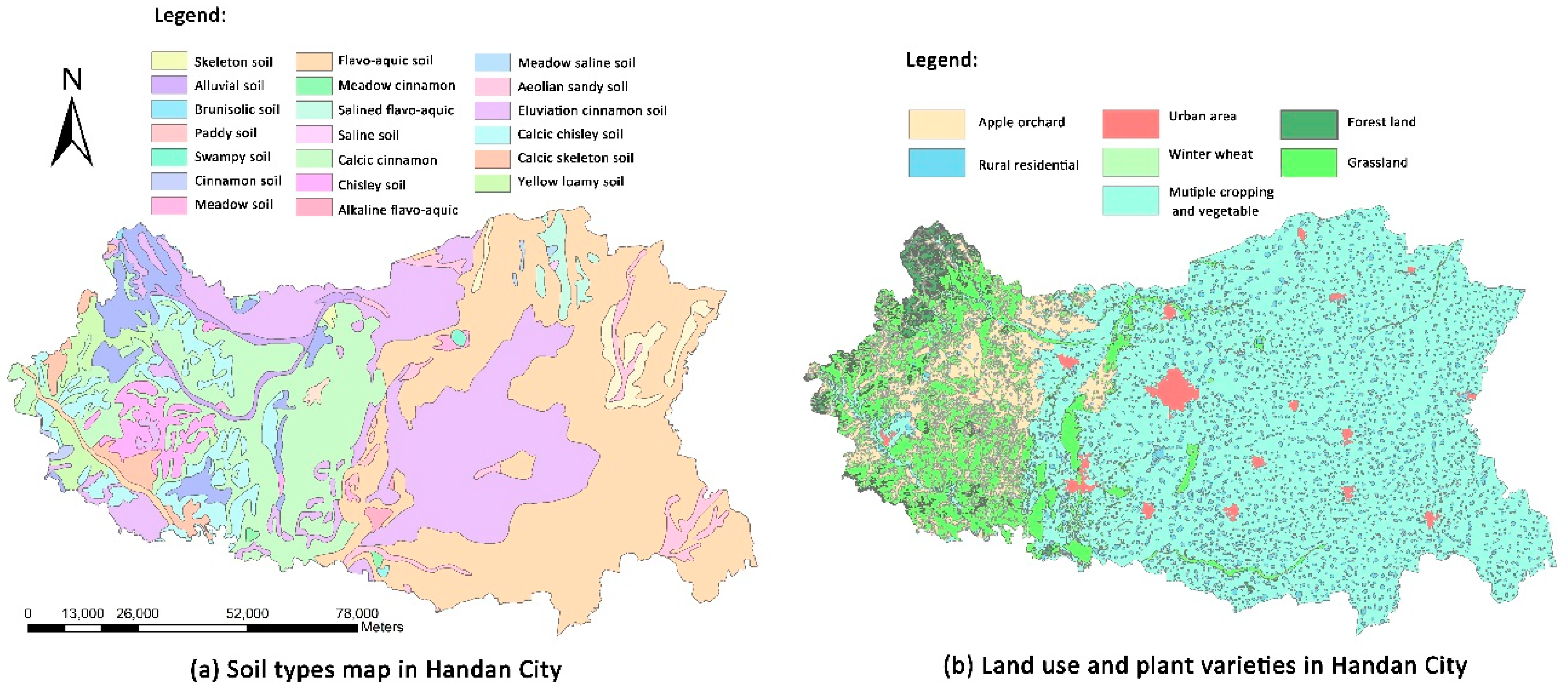 One of the most important objectives of this research is to simulate the soil moisture in the farmland. In MODCYCLE, the Green–Ampt method is used to simulate the soil water infiltration and percolation process using land use data, plant variety, and soil type as key parameters. In this research, the land use data in the study area were retrieved by remote sensing. Five main land use patterns are included in the study area: farmland, forest land, grassland, urban areas, and rural residential areas. Farmland covers the largest area of Handan City, accounting for 86% of the total area. The crop variety data in this research were collected from the Rural Statistical Yearbook of Hebei Province combined with the field survey. For the field survey, we visited more than 100 farmers to determine the crop varieties and planting areas, particularly in Daming and Quzhou County. The survey data were used to verify the reliability of the Rural Statistical Yearbook of Hebei Province. The statistics indicate nine crop varieties in the study area, with winter wheat, multiple cropping of wheat and summer maize, cotton, vegetables, and apple orchard as the five dominant crops. The soil-type data were collected from the China Soil Scientific Database and were validated through high-density sampling experiments. Generally, 22 soil types are included in the study region. The distribution maps of the planting varieties with land use and soil type in the study area are separately shown in Figure 3a,b.