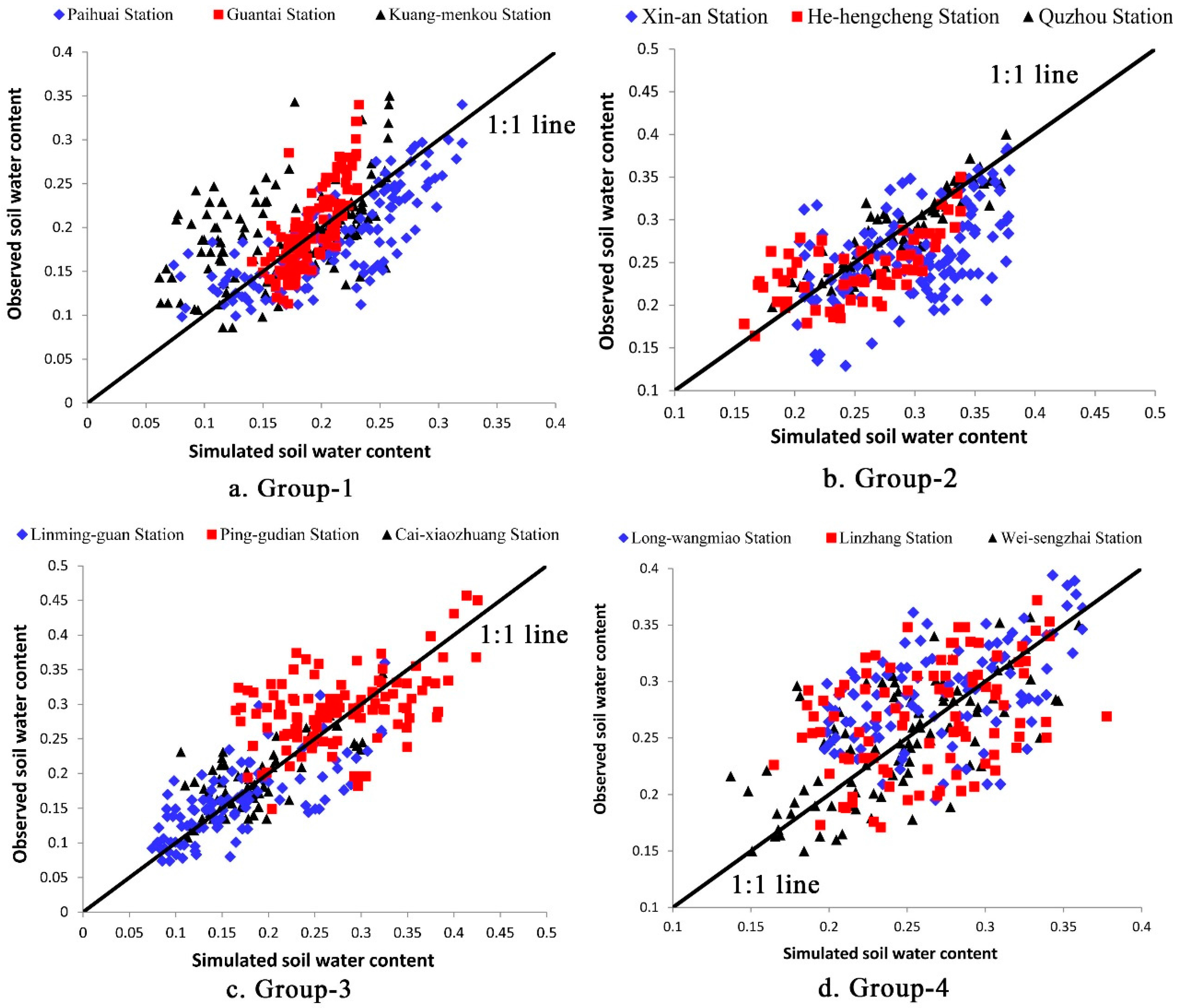 In our study, we compared the simulated and soil observed water contents to validate the model. The observed soil water content data were obtained by sampling in the soil profile, where the average depth of the soil profile was usually 600 mm. Four sampling points were selected in one soil profile at depths of 0–15 mm, 15–30 mm, 30–45 mm, and 45–60 mm. After the soil samples were collected, the soil water content was measured using the oven drying method. Based on the above measurements, the average soil water content in the entire soil profile was calculated as the weighted average value of the soil water content of the four sampling points. We collected the in situ observed soil moisture data from 12 soil moisture monitoring stations evenly distributed in the study area. A list of these stations is given in Table 5. For convenience, the 12 monitoring stations were also classified into four groups.