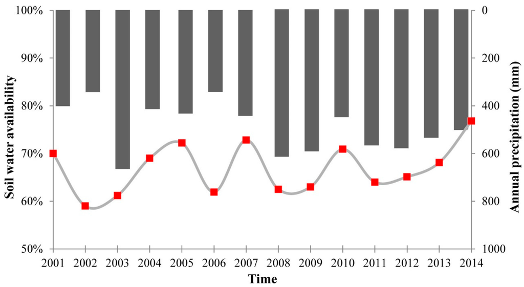 As previously mentioned, the simulation period in this study was from 2001 to 2014. Based on the simulation results, the comprehensive soil water availability in the entire study area from 2001 to 2014 was calculated, as shown in Figure 5.