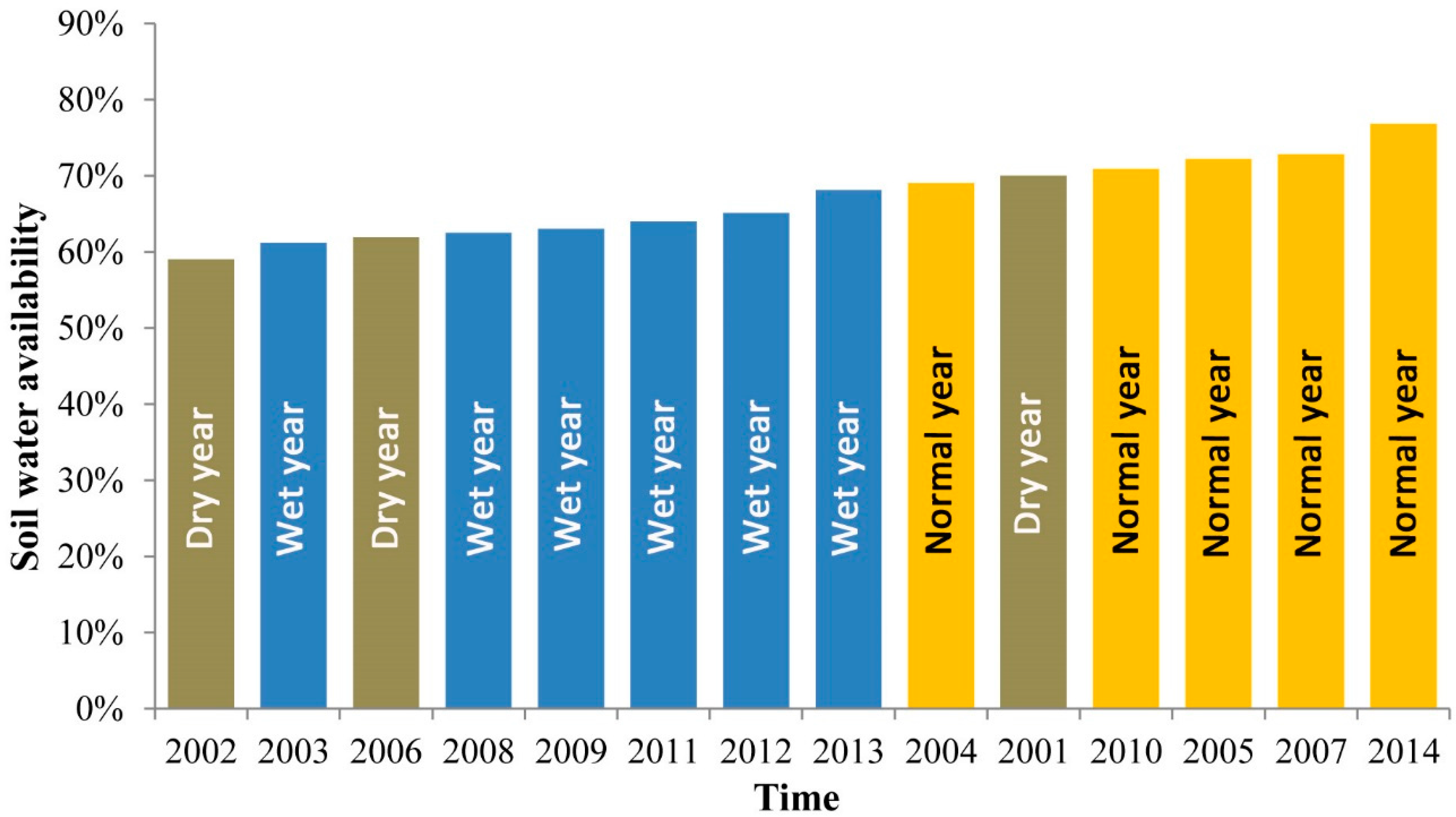 Figure 6 shows the SWA from 2001 to 2014 sorted in ascending order. The high-soil-water-availability years were concentrated mainly in normal hydrological years. Five normal hydrological years were indicated in the simulation period, in which the SWA, shown by yellow bars in the figure, was much higher than that in dry and wet years, shown by brown and blue bars, respectively. Preliminary analysis indicated that in dry years, the water supply from precipitation was deficient, which cannot satisfy plant water requirements during the growing period. Therefore, the poor degree of matching between the soil water supply and plant water demand is the primary reason for the low SWA in dry years. In wet years, the precipitation was concentrated mostly in summer. Therefore, the available soil water distribution was extremely uneven, which in turn resulted in significant water loss in the rainy season, leaving plants vulnerable to drought in the sowing season.