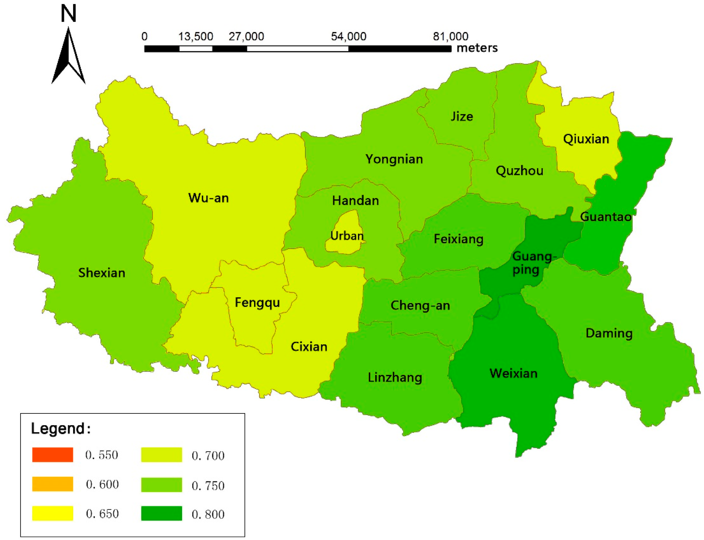 According to the analysis in Table 10, it is concluded that the potential for improvement of the factors differs among regions. For example, in the Wu’an Region, the indices and were much higher those of other factors, which means that the factors and have a large potential to be increased for a higher contribution to SWA. However, in the Jize Region, the indices and were much higher than those of other factors, which means that the factors and have large potential to be increased for a higher contribution to SWA. The values of the index changed dramatically among the regions. Therefore, to improve the SWA in the study area, different measures must be taken according to the different potential of the factors in different regions.