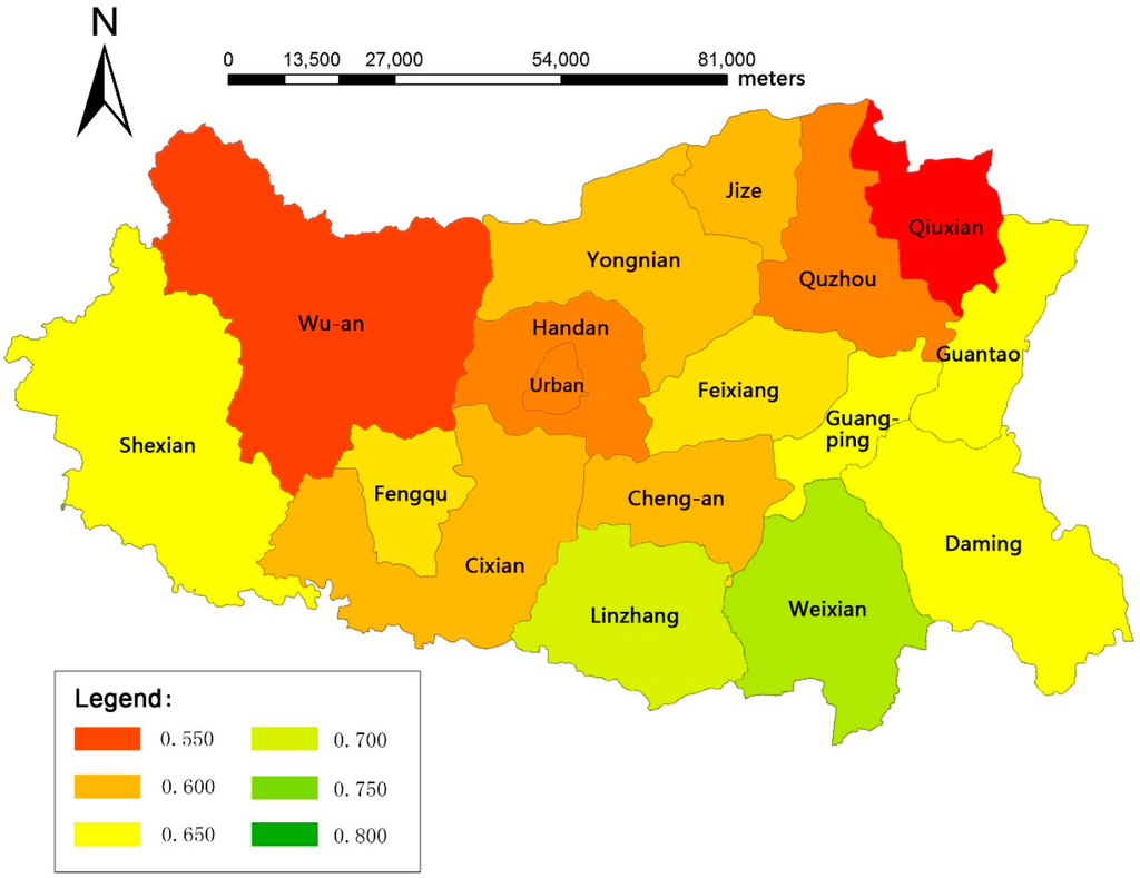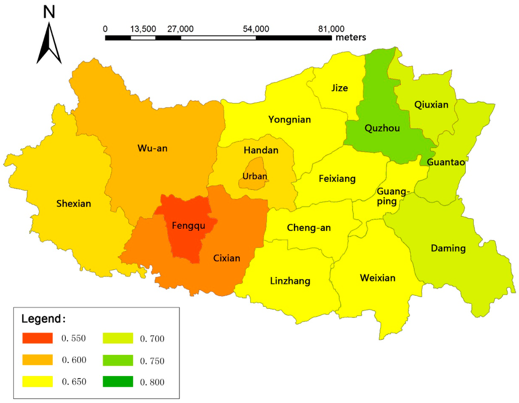 Finally, as shown in Table 10, was mostly above 30% in all 17 regions, although the index was only 29.6% in the Linzhang Region. Obviously, the potential of improving the factor is quite large in all of the regions in the entire study area. Therefore, increasing the soil water use efficiency for crop growth, such as mulching to reduce invalid evaporation and adopting regulated deficit irrigation, is a key approach for increasing the SWA.