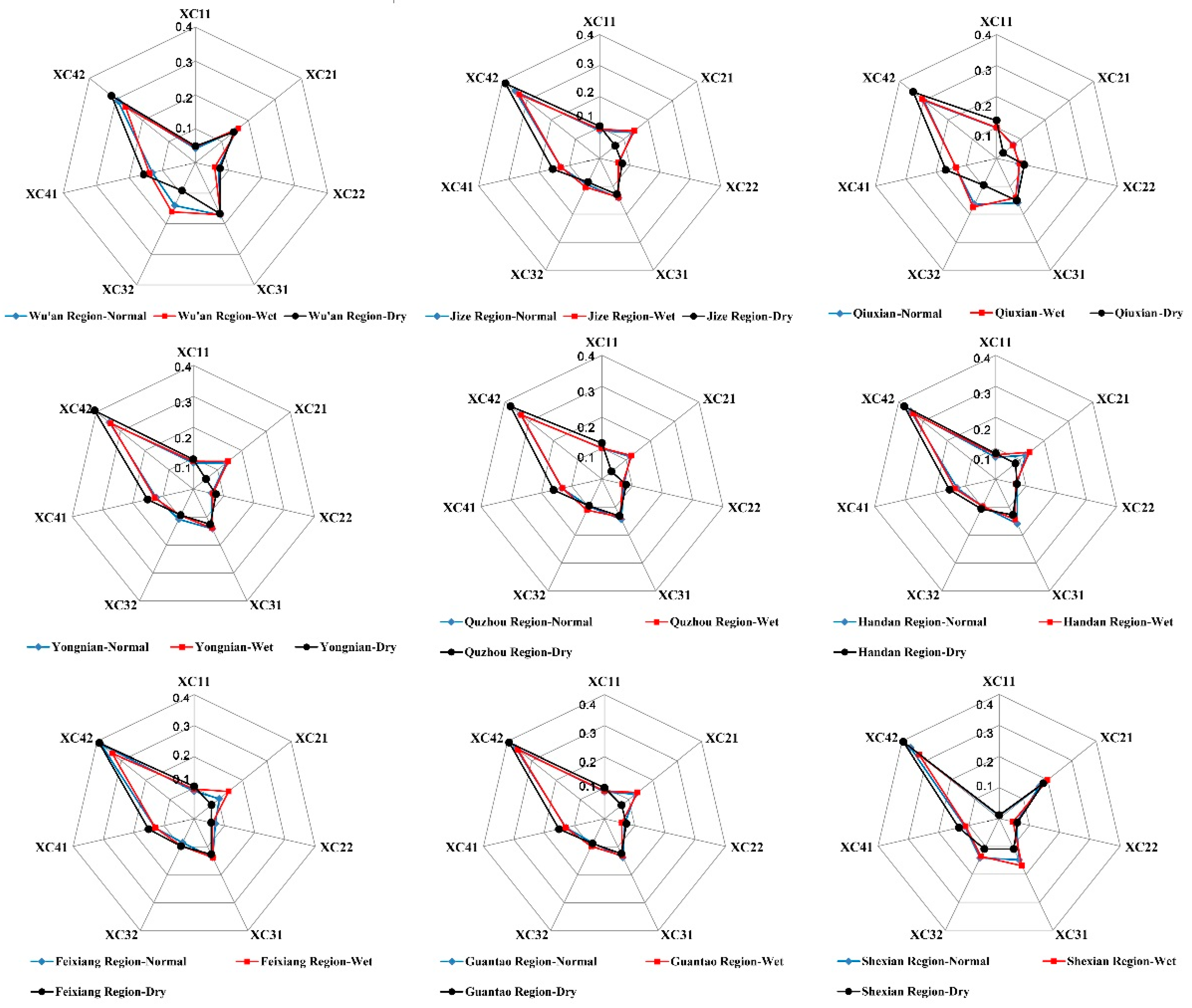 Contribution ratio of different factors to the comprehensive SWA in Wu’an, Jize, Qiuxian, Yongnian, Quzhou, Handan, Feixiang, Guantao, and Shexian regions in different hydrological-level years. As shown in Table 1, the factor of C11 represents the valid physical capacity of the soil reservoir, C21 represents the average value of the annual empty storage capacity of the soil reservoir, C22 is the factor for the average annual variation of the empty storage capacity of the soil reservoir, C31 represents the factor for the temporal matching degree between the soil water supply and crop water demand, C32 represents the factor for the spatial matching degree between the soil water supply and crop water demand, C41 is the factor for the soil water conversion efficiency, and C42 is the factor for the crop use efficiency of the soil water.