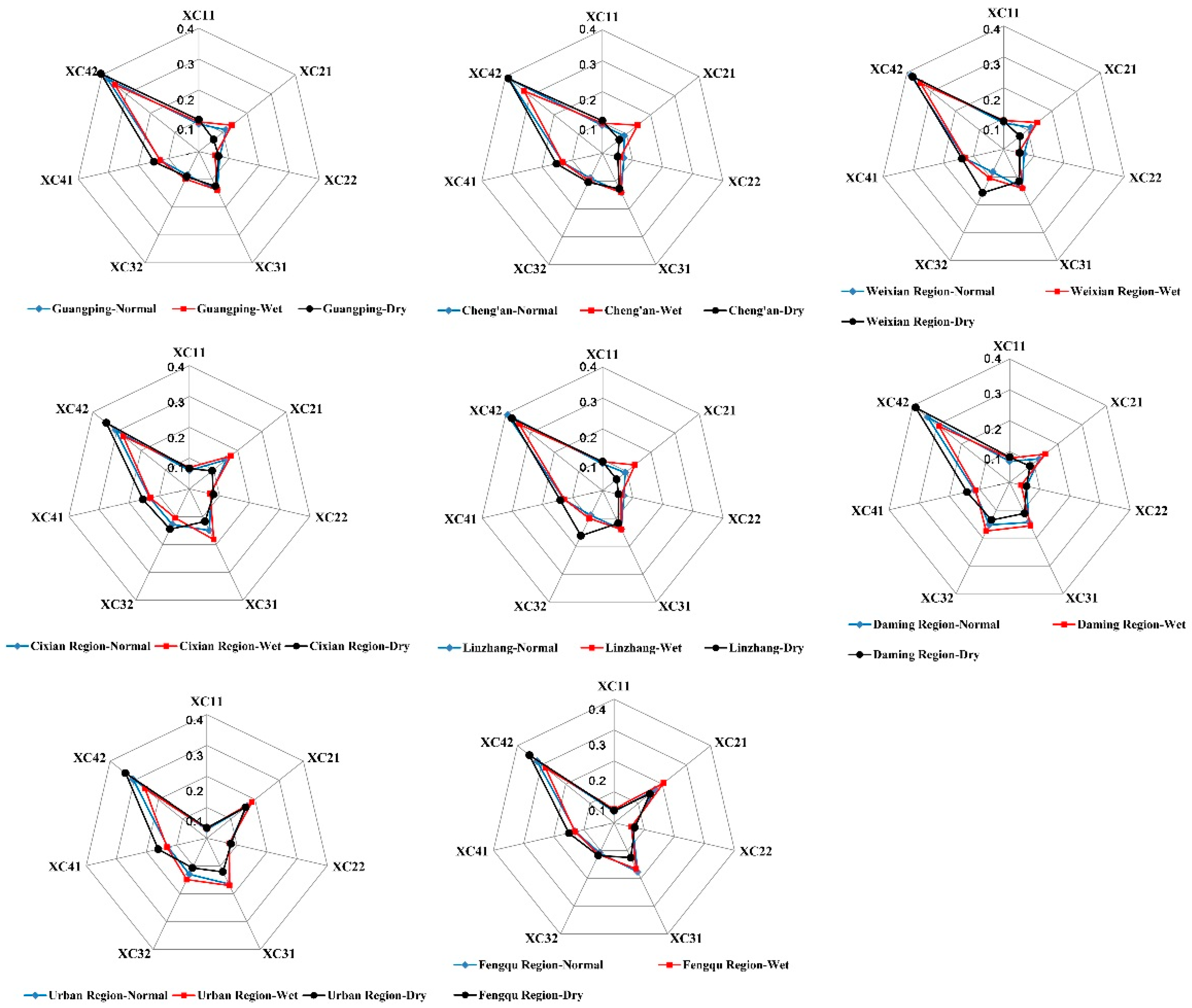 Contribution ratio of different factors to the comprehensive SWA in Guangping, Cheng’an, Weixian, Cixian, Linzhang, Daming, Fengqu, and urban regions in different hydrological-level years. As shown in Table 1, the factor of C11 represents the valid physical capacity of the soil reservoir, C21 represents the average value of the annual empty storage capacity of the soil reservoir, C22 is the factor for the average annual variation of the empty storage capacity of the soil reservoir, C31 represents the factor for the temporal matching degree between the soil water supply and crop water demand, C32 represents the factor for the spatial matching degree between the soil water supply and crop water demand, C41 is the factor for the soil water conversion efficiency, and C42 is the factor for the crop use efficiency of the soil water.