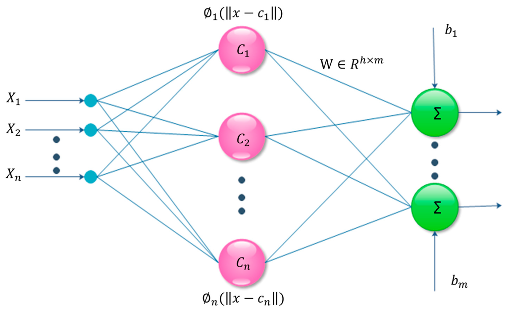 RBFN has a faster learning speed than the back-propagation (BP) network, and its function approximation ability, model recognition, and classification ability are also better than those of the BP network [29,30]. The BP network is a type of global approximation network that makes a corresponding parameter adjustment for each input and output data. However, RBFN is a type of local approximation network. The output of the network is determined only by a small number of neurons. The neurons of the BP neural network have a large visible input region because this method uses the sigmoid() function as its activation function, while RBFN uses the radial basis function and generally the Gaussian function as its activation function, which makes the neurons in the input control area very small and therefore requires additional radial basis neurons. Because the generalization ability of RBFN is better than that of the BP network, the RBF network has been widely used in many fields of research [31,32].