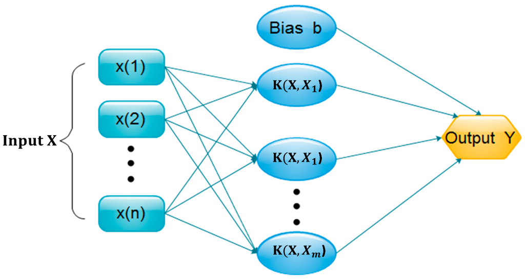 SVM was proposed by Vapnik [33] for applications to the classification of data and text, system modeling and prediction, pattern recognition, anomaly detection, and time series prediction, similar to that of the multilayer perceptron network and the Radial Basis Function Network. SVM has versatility, robustness, effectiveness, and computational advantages, such as being simple. This method solves practical problems using only a simple optimization technique, and has obtained good results. The system structure is shown in Figure 2.