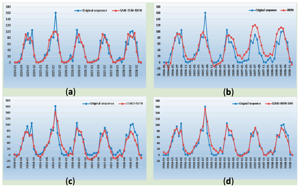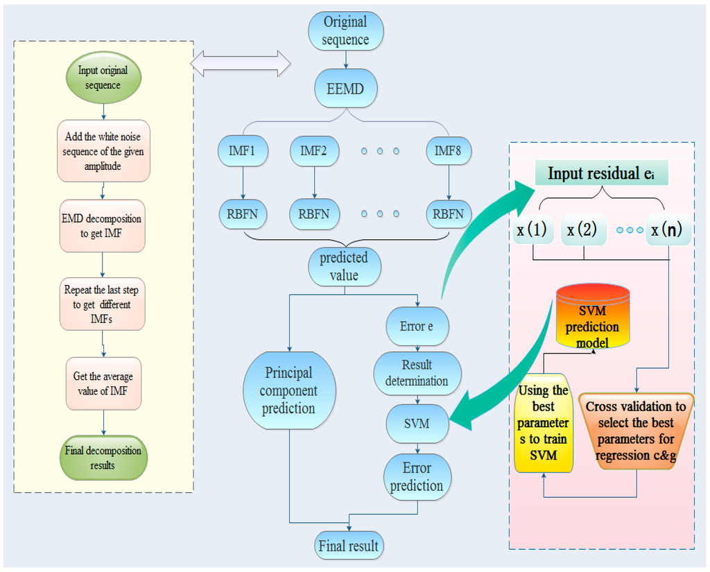 EEMD can deal well with nonlinear and nonstationary data series and can extract useful information from the data by decomposing the original data series. In Wang’s article [20], the autoregressive integrated moving average (ARIMA) model coupled with EEMD is presented to forecast annual runoff time series. The results indicate that EEMD can effectively enhance the forecasting accuracy. The radial basis function neural networks (RBFN) model is widely used in time series analysis and can effectively forecast data series because it has good generalization ability. The Support Vector function (SVM) model can effectively avoid the local minima problem and has good generalization ability. These three models are widely used when dealing with nonlinear and non-stationary data series. Model choices have a large influence on the prediction results, and the selection of parameters will determine a model’s quality [21].
