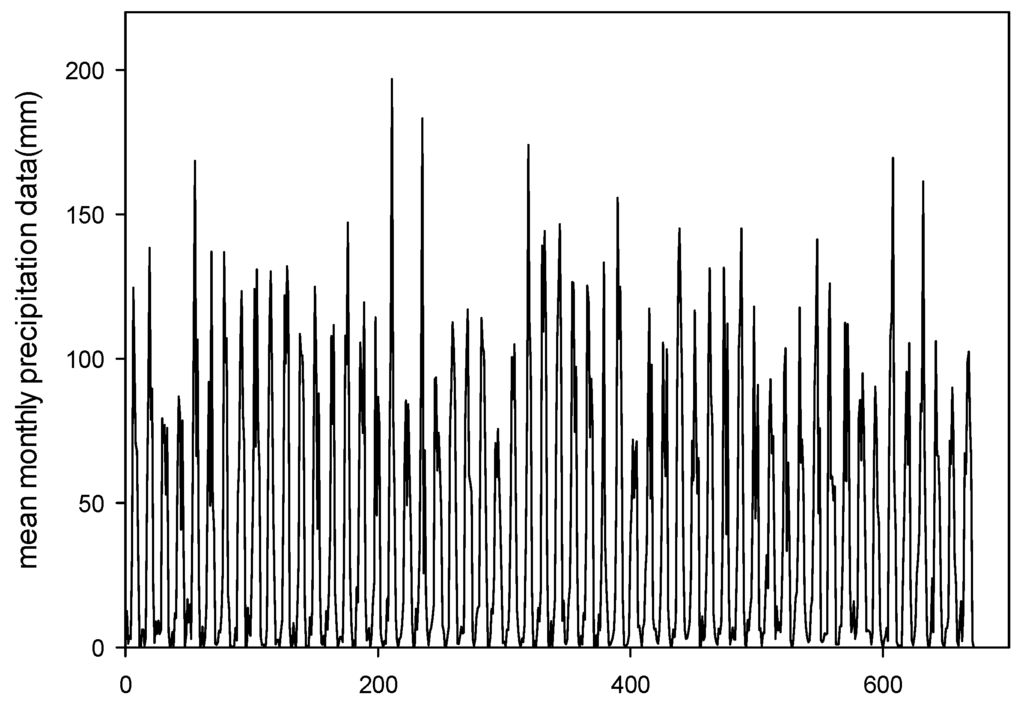 Because the precipitation in Yushu in recent years has not changed much compared to previous years, we selected data for Yushu from January 1953 to December 2008 to establish the model. The data are shown in Figure 5. From the trend graph in Figure 5, we can see that the precipitation data are obviously nonstationary and nonlinear.