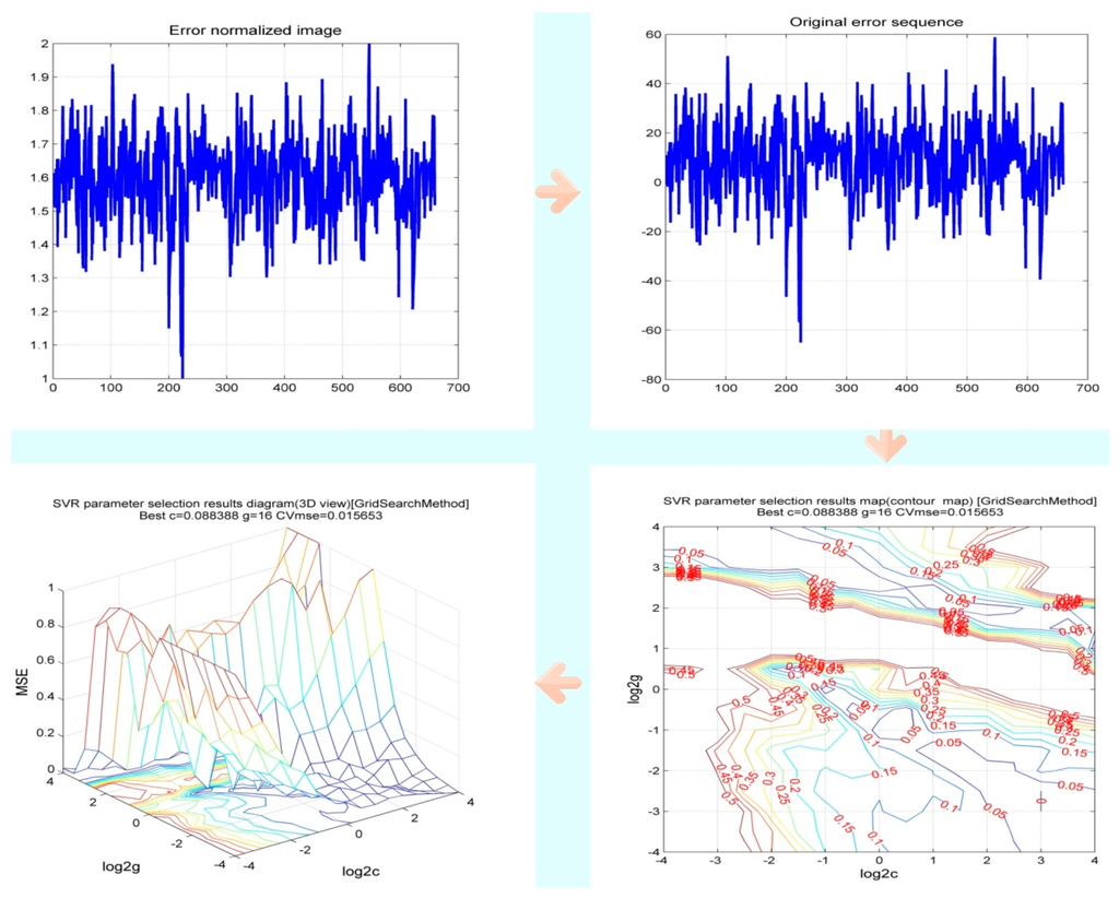 The prediction of the original sequence will produce a certain error. This study used the SVM method to predict the error term. Using the 1st to the 659th data points as the input values and the 2nd to the 660th data points as the output value, we obtained 60 error terms (). Cross validation was employed to optimize the parameters, and the final optimization results are g = 16, and c = 0.088388 (c is the penalty parameter of svmtrain, and g is the kernel function parameter). The process is shown in Figure 7. Finally, the predicted value of the original sequence was obtained by combining the prediction results of RBFN.