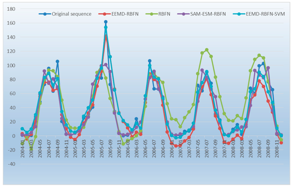 This hybrid EEMD–RBFN–SVM model has the following advantages. Via the decomposition of the original sequence using EEMD, the nonstationary and nonlinear signal sequence is decomposed into a set of steady state and linear sequence, which enables us to fully use all the information in the sequence. RNFN is used to predict the decomposition of the sequence set because it has a better ability for nonlinear fitting than the general neural network and can approach any nonlinear function with any precision. This makes RBFN capable of predicting the decomposition sequence effectively. Finally, SVM is adopted to further optimize the prediction error of the sequence, so that the prediction accuracy can be further improved. This hybrid model fully considers various factors, from decomposition to prediction to error correction, and achieves a good prediction effect in hydrological data forecasting by making the best use of the information hidden in the sequence. Therefore, the proposed approach can improve the prediction accuracy effectively.