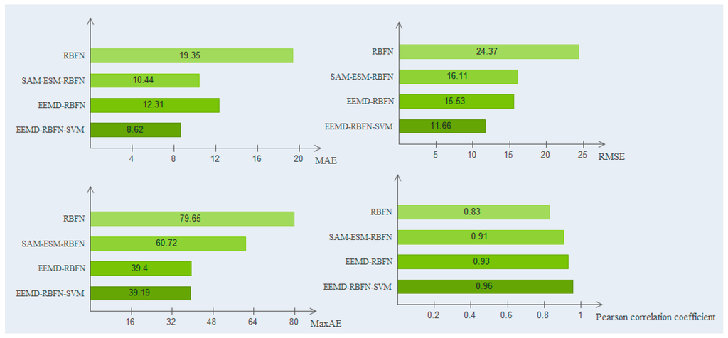 To assess the forecast capacity of the EEMD–RBFN–SVM model, four indices for error forecasting serve as the criteria to evaluate the forecasting performance. They are RMSE, MAE, MaxAE, and the Pearson correlation coefficient. Their effects are shown in Table 1 and Figure 10. For RMSE, MaxAE, and the Pearson correlation coefficient of the evaluation index, the prediction effect of the hybrid EEMD–RBFN–SVM model is the best, the EEMD–RBFN model is second, the SAM–ESM–RBFN mixture model is third, and the RBFN model is the worst. For the MAE index, the hybrid EEMD–RBFN–SVM model is still the best, the hybrid SAM–ESM–RBFN model is second, and the RBFN prediction effect is the worst. After a comparison of the above-mentioned models, it can be seen that all the indexes (RMSE, MAE, MaxAE, and the Pearson correlation coefficient) for the proposed model are lower. This indicates that the hybrid EEMD–RBFN–SVM model is an effective approach.