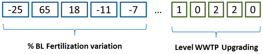 However, management outcomes could be substantially improved by applying the multi-objective optimization capabilities of the framework. Focusing only on point source pollution, a first optimization process was run for WWTPs upgrading decision process while keeping fertilization at BLS conditions. In this case, each management strategy was coded as a chromosome of length 553 (one per WWTP). Each WWTP had three possible options: 0 (no upgrade), 1 (upgrade to level CN), or 2 (upgrade to level CNDP). The population size was 60, a crossover probability of 0.9, and a mutation probability of 0.1. The optimization process was stopped after 60 generations (3600 evaluations of the model), when the improvement from one generation to the next was negligible (convergence criteria).