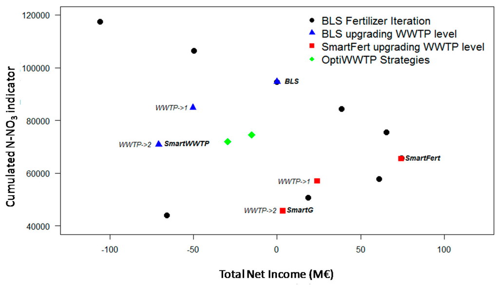 Figure 5) corresponding to the maximum total net income. Once this fertilization rate is exceeded, total net income starts to decrease, while pollution continues to increase. Compared to the BLS, the SmartFert strategy corresponds to a reduction of 35% in mineral fertilizer rate applied, and results in an increment of total net income of 75 M€ and in a 30% reduction of cumulated N-NO