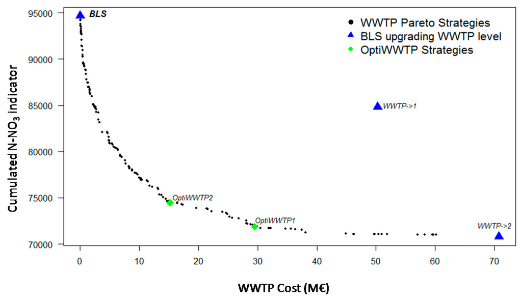 Table 6). Both OptiWWTP1 and OptiWWTP2 strategies offer a good compromise between economic and environmental objectives. In the OptiWWTP1, 77 plants should be upgraded to CN and 180 to CNDP; in OptiWWTP2 64 plants should be upgraded to CN and 102 to CNDP. No change would occur for the remaining WWTPs.
