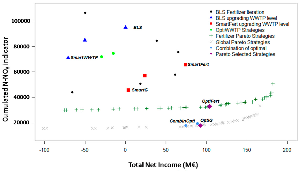 Two additional strategies were generated by combining the OptiWWTP1 and OptiWWTP2 with the OptiFert strategy selected from the fertilization only Pareto set (