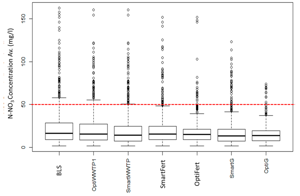 3 pollution is low (i.e., below the WFD threshold of 50 mg/L) in the BLS, there are no significant differences between the three strategies. Conversely, in the reaches where N-NO