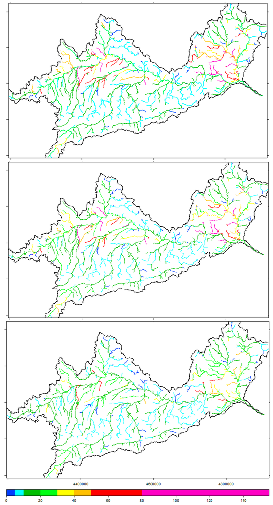 50]) of 0.57. For the validation dataset, the PBIAS% was satisfactory for more than 60% of gauged stations (average values of 9.7%) and for these the average Nash Sutcliffe was around 0.53. More details about the model setup and the calibration procedure can be found in Malagó et al. [