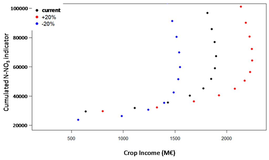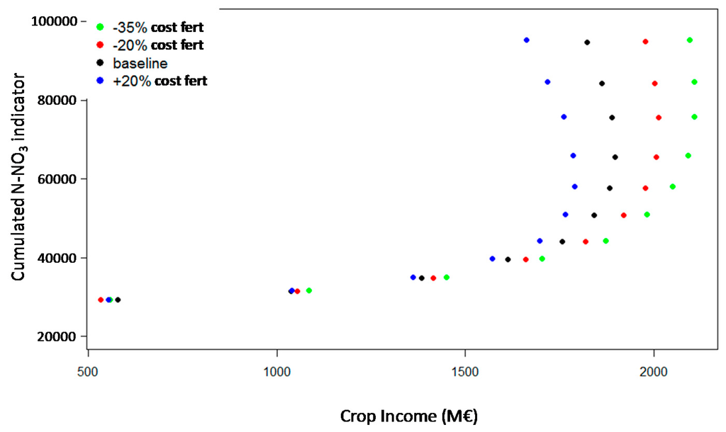 3 concentration exceeding a 50 mg/L threshold) and on one synthetic economic objective (i.e., maximizing the total net income). Efficient strategies that could significantly improve current water quality status were found. Our analysis suggests that a proper management of mineral fertilization can lead to important environmental benefit without affecting farmer economic income. Reducing the mineral fertilization rate by around 35% will allow obtaining a 30% reduction of N-NO