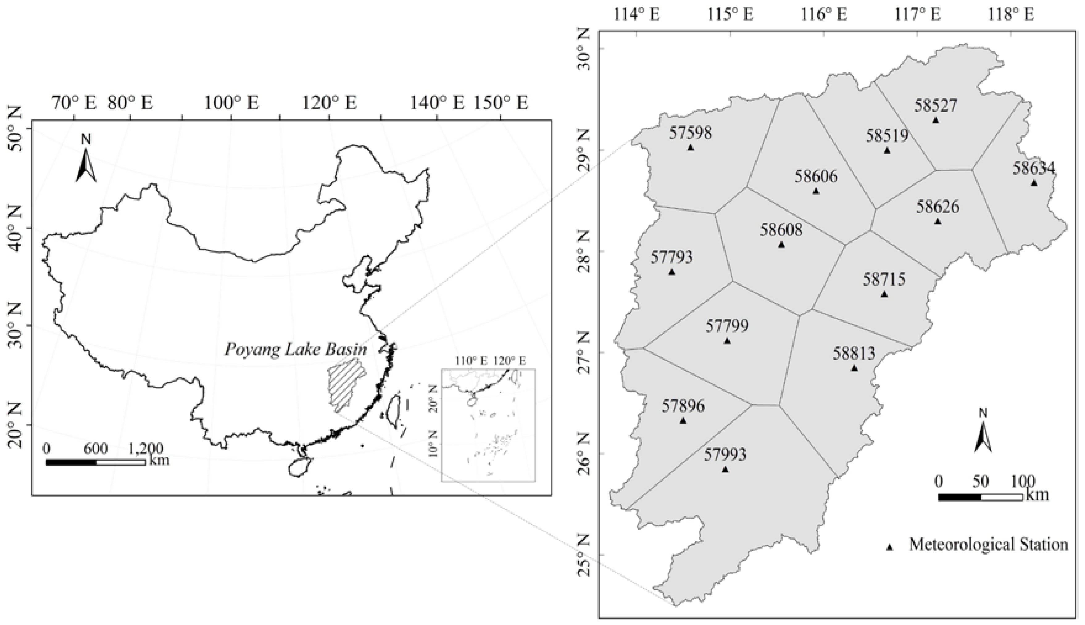 The Thiessen polygons of 13 meteorological stations in the Poyang Lake Basin are shown in Figure 1. The weighting values of individual Thiessen polygons are listed in Table 2.