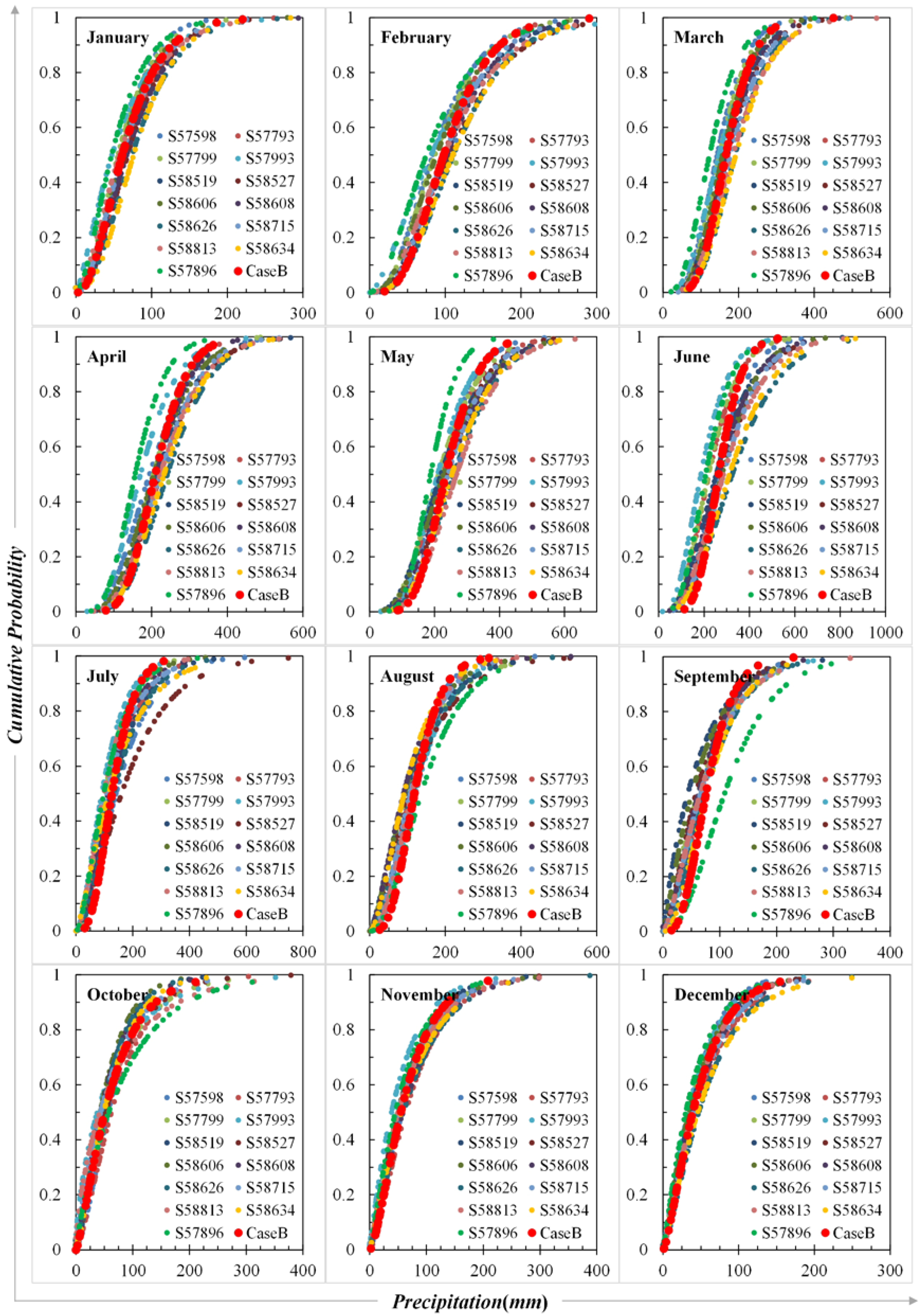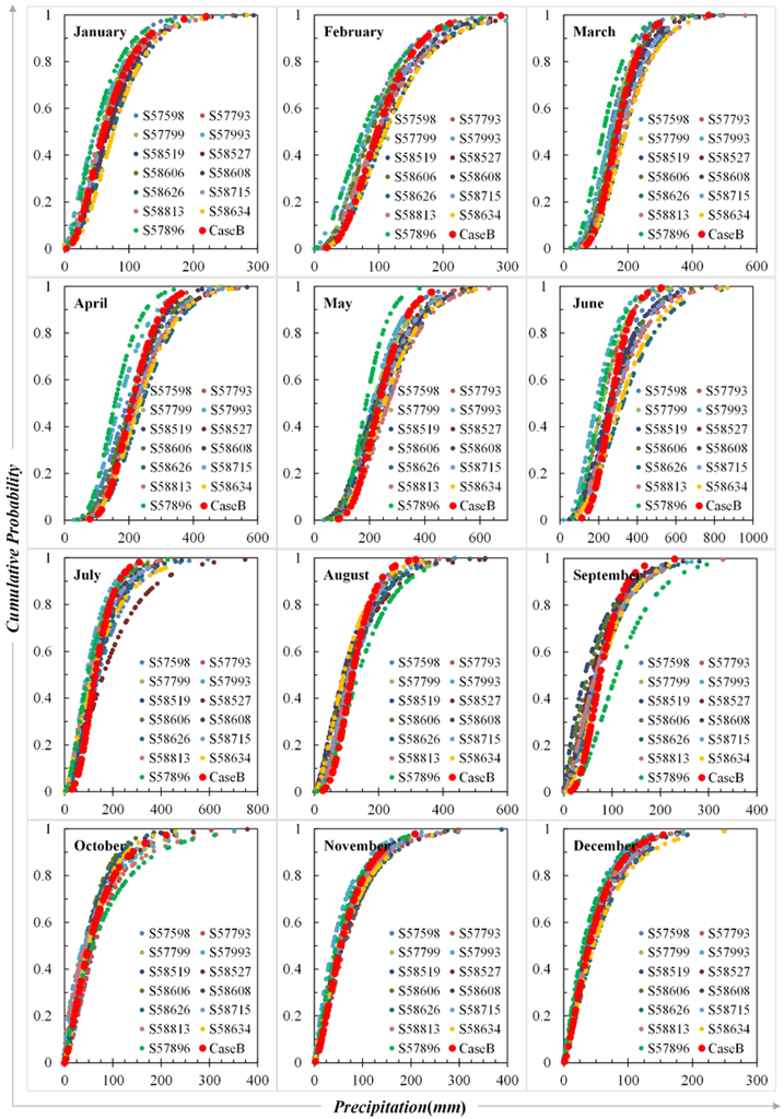Figure 2 displays the cumulative-probability curves for 13 stations and Case B in January–December. The cumulative-probability curves were highlighted in red color for Case B. The distribution curves were more dispersed in February–September than other months. Moreover, the growth rate was generally faster for Case B, indicating more clustered precipitation for the period, which was consistent with that shown in Table 3. Noticeably, the cumulative probabilities at less precipitation for Case B were generally smaller than that for most of stations, but greater than that for most of stations at larger precipitation. The phenomenon was more distinctly observed in February–September (Figure 2). It indicated there was less frequency at relatively less or larger precipitation, while the majority of precipitation was located in the middle part of the gamma density distribution.