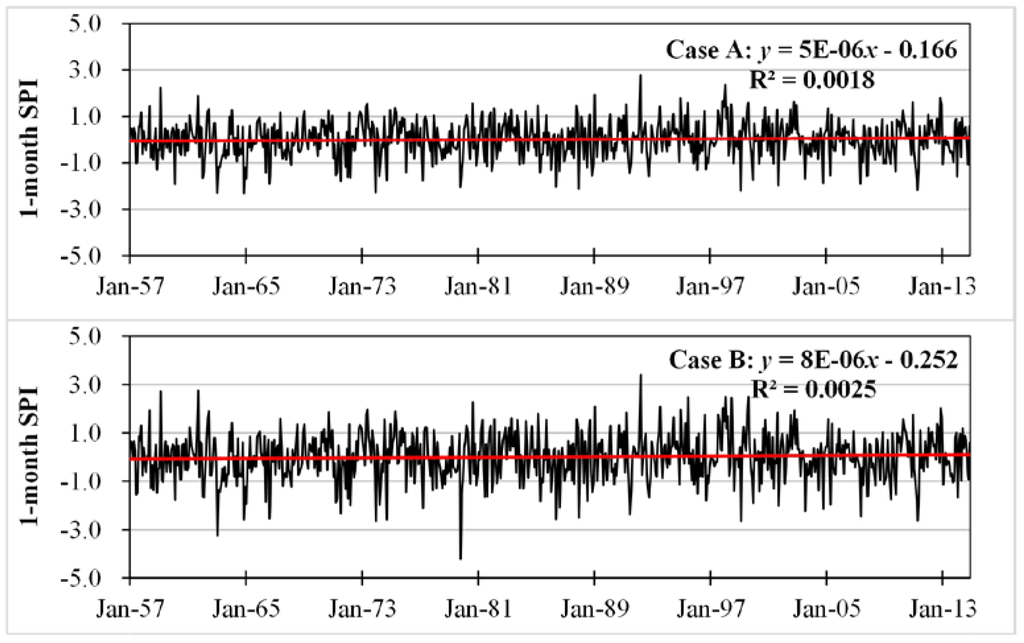 Figure 3 illustrates the SPI time series obtained from two different processing schemes. The tendencies of the Poyang Lake Basin meteorological droughts were described by y = 5E-06x − 0.166 (R2 = 0.0018) for SPI time series obtained from Case A and y = 8E-06x − 0.252 (R2 = 0.0025) for SPI time series obtained from Case B, where x is the calendar month, respectively. Both series had similar features and trends of regional meteorological droughts. The slope of regression line was approximately 0 for either case. The fluctuation pattern generally stayed consistent, while their extreme values were greater for Case B than that for Case A. It implied that the Case A processing scheme could reduce the spatiotemporal variability in precipitation.