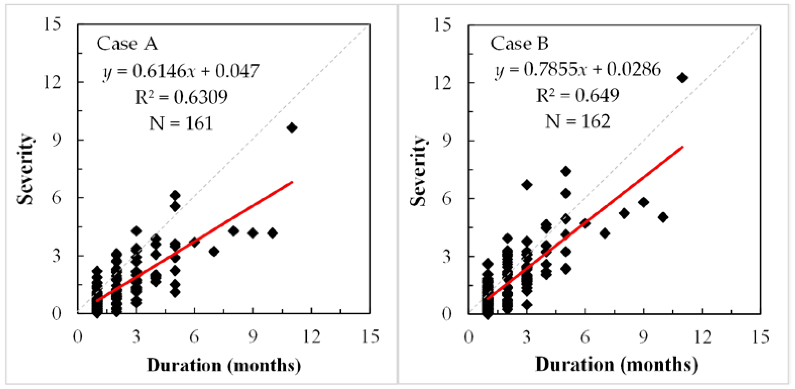Table 4 shows the statistics of meteorological droughts obtained from two different processing schemes, in terms of drought event number, drought duration, and drought severity. The Case B processing schemes identified 162 drought events for 1957–2014, which was only one more than that for Case A. The drought duration ranged from 1 month to 11 months with 2.13 ± 1.72 months for Case A, approximately equal to that for Case B (2.13 ± 1.69 months). However, drought severity ranged at 0–12.26 with 1.70 ± 1.65 for Case B, generally greater than that for Case A. The quantitative statistical relationship of drought duration and severity of all drought events from two processing schemes was given in Figure 4. As indicated in Figure 4, the durations of most of drought events ranged from 1 to 4 months. The severity of drought events was generally aggravated in the case of Case B compared to that of Case A, which was also exhibited in Figure S1. Severe meteorological drought events were captured such as in 1963, 1978, 1997, 2003, and 2013 (Figure 4 and Figure S1). Moreover, the onset and termination time were almost identical for all the individual drought events. In addition, the slope of linear relationship for Case B was 0.7855 (R2 = 0.649), which was larger than 0.6146 (R2 = 0.6309) for Case A. In general terms, compared with that for Case B, the drought severity for Case A was generally smaller at the same drought duration. It might impact on drought assessment and quantitative approaches related to it.