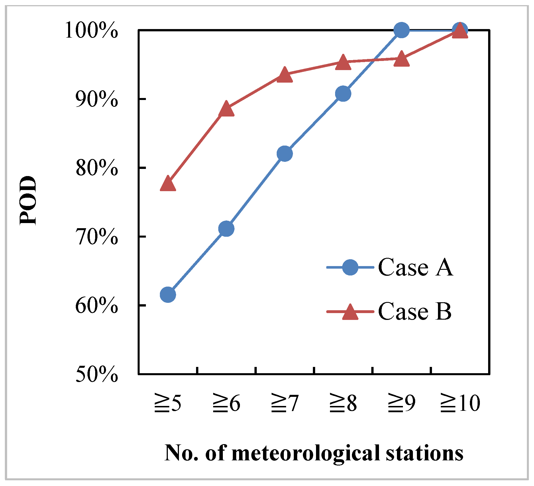 Figure 5 shows change of probability of detection (POD) varying with available meteorological stations for regional drought monitoring. As indicated in Figure 5, POD increased gradually with more available stations in both processing schemes. When the available stations were less than 8 (61.5% of total stations), POD was obviously higher for Case B than Case A. When the station number was more than 8, POD approached to 91%–100% for both processing schemes. In this case, both schemes could identify the regional droughts with a high detectability.