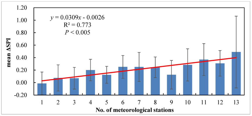 The difference of both processing schemes in drought detectability is related to available stations for monitoring. Figure 6 illustrates the relationship between ΔSPI and the number of meteorological stations for monitoring regional droughts. The statistics relationship of x (number of available meteorological stations) versus y (mean ΔSPI) was described by y = 0.0309x − 0.0026 (R2 = 0.773, p < 0.005). It indicated that ΔSPI had a positive correlation with the station number in the same period (p < 0.005). When the number of stations exceeded 10 (76.9% of total stations), ΔSPI was higher than 0.284. It reached up to 0.489 for 13 stations.