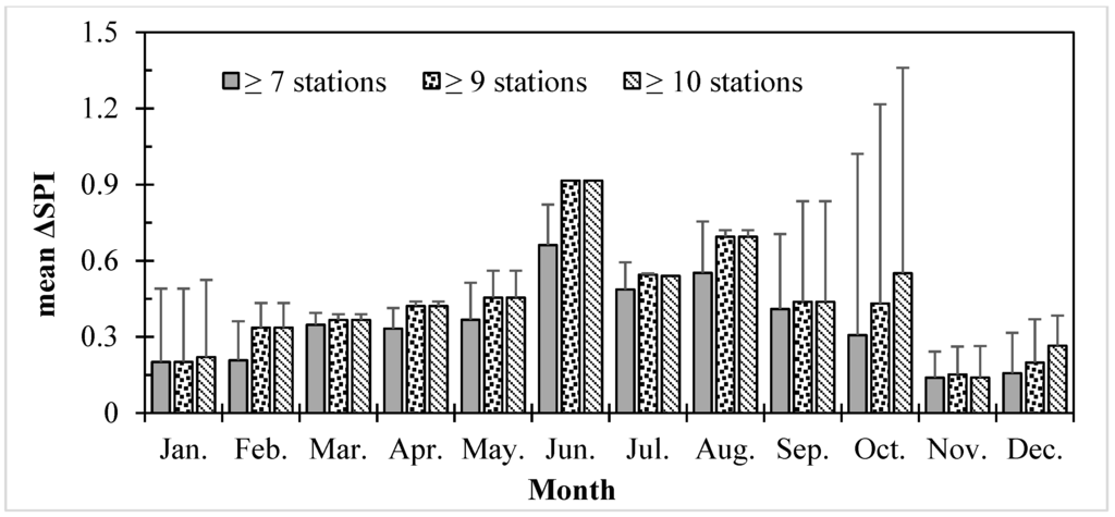 Furthermore, the relationship between ΔSPI and number of stations had seasonal variation. Figure 7 shows the variation under three different situations. The multi-year mean ΔSPI at first increased and then decreased. The maximum variation (ΔSPI = 0.662 for ≥7 stations) was in June, whereas the minimum (ΔSPI = 0.139 for ≥7 stations) appeared in November. When the number of stations was ≥9, the multi-year mean ΔSPI reached up to 0.916 in June and down to 0.151 in November. The phenomenon was found in other calendar month with ≥10 stations. Hence, ΔSPI aggravated gradually with an increase of number of stations for monitoring regional droughts in the same period, even if the annual tendency remained unchanged.