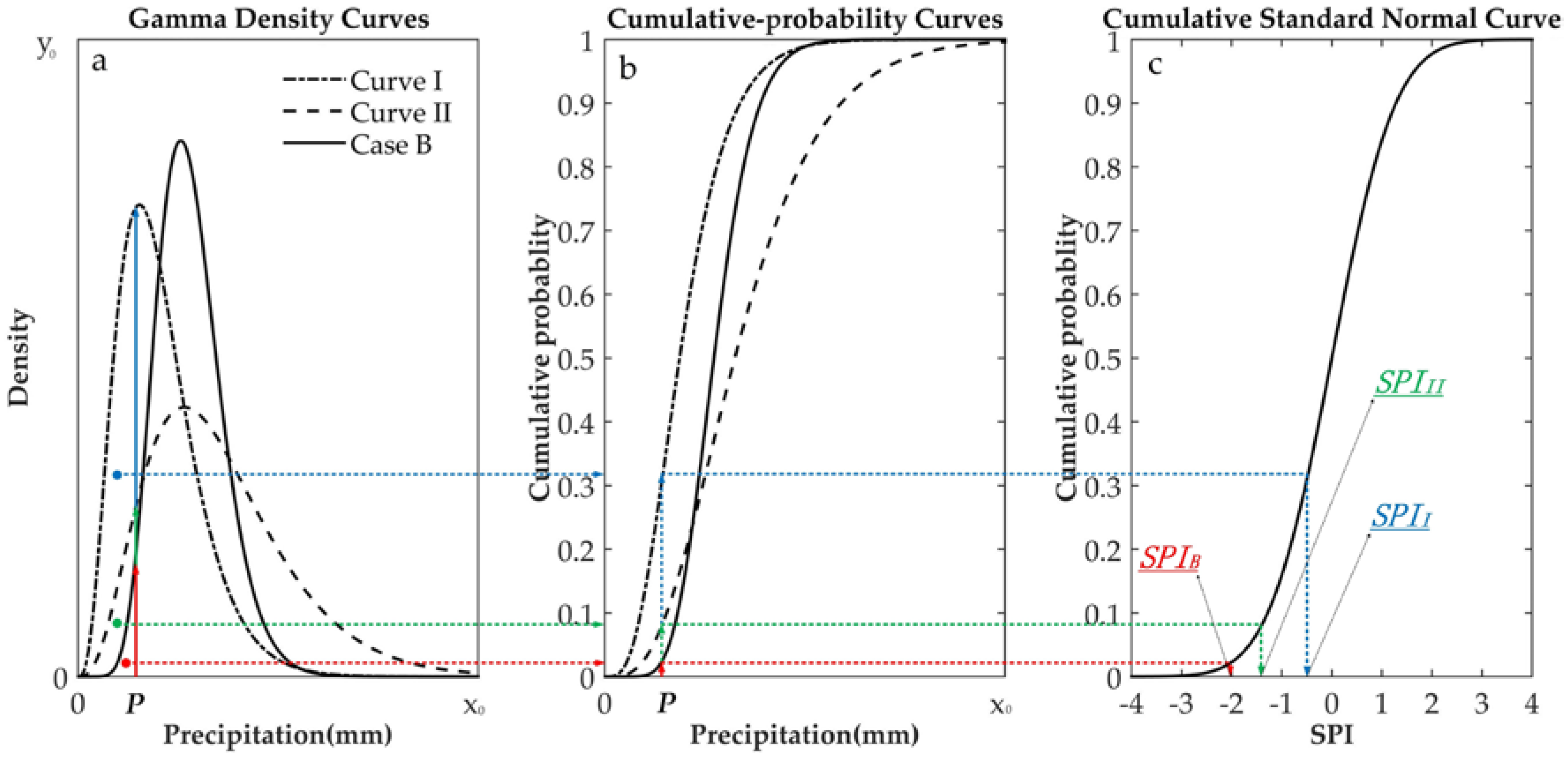 Figure 8a shows three precipitation-density curves. Curve I and Curve II exhibited positive skew-distribution, whereas the curve for Case B was close to normal distribution. The maximum precipitation frequency peak was found in Case B obtained from the precipitation-mean scheme. Therefore, the precipitation-mean processing scheme generally weakens the extreme precipitation and made the precipitation series smoother. Then, when the precipitation was P, the cumulative probabilities from largest to smallest were in Curve I, Curve II, and Case B (Figure 8b). Furthermore, when the precipitation was less than P, the cumulative probability for Case B was even much smaller. Finally, the cumulative probabilities for three curves at P value were transformed into SPII, SPIII, and SPIB through the inverse of the cumulative standard normal distribution function respectively (Figure 8c). The mean of SPII and SPIII was distinctly larger than SPIB.