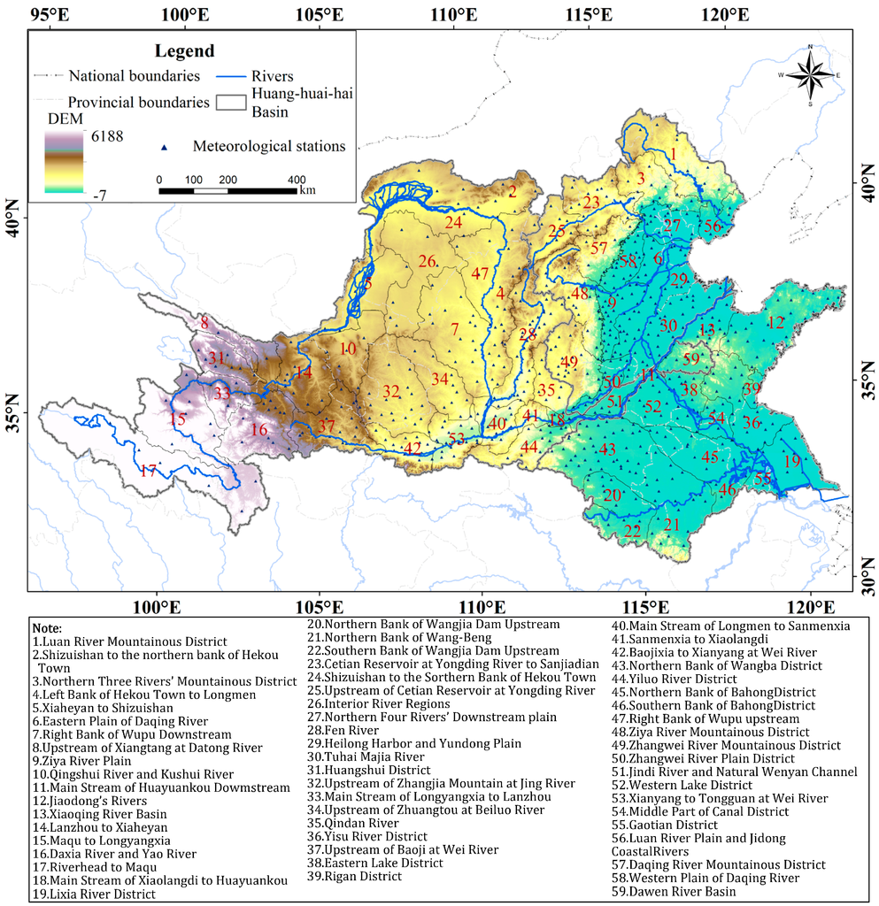Meteorological stations and three-level water resources districts in the Huang-Huai-Hai River Basin.