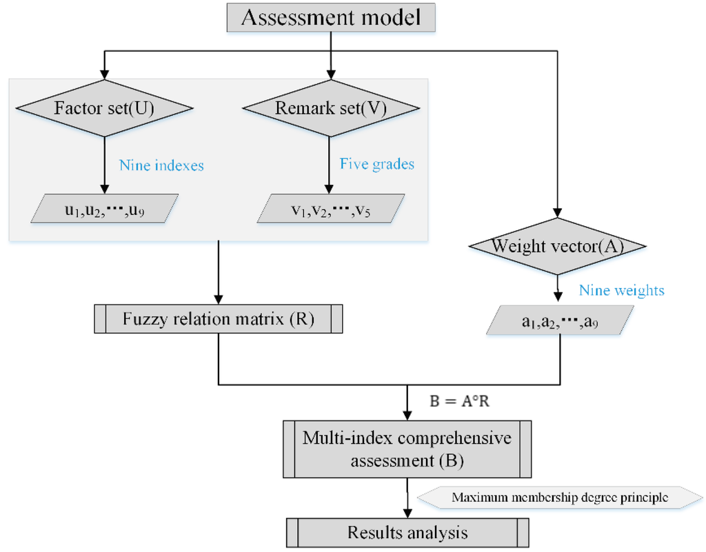 - Analyze the results. The remark grade corresponding to the maximum of each component in the assessment result matrix B is taken as the comprehensive assessment result according to the maximum membership degree principle.