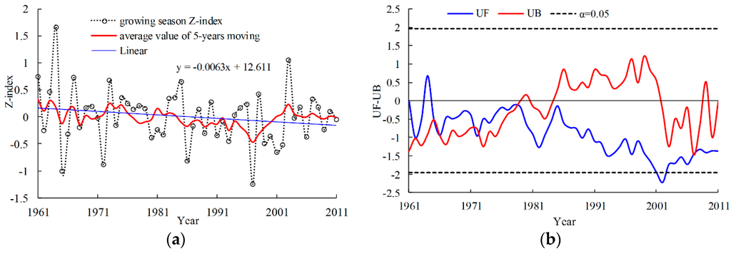 Trend of growing season Z-index in the Huang-Huai-Hai River Basin: (a) growing season Z-index; and (b) result of MK test.