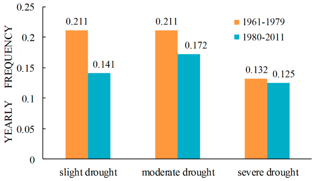 The percentage of the years suffering drought divided into two periods, 1961–1979 and 1980–2011, is determined in order to analyze the frequency of different drought categories in the Huang-Huai-Hai River Basin. The yearly frequency of slight drought, moderate drought and severe drought is shown in Figure 5 and Figure 6. It is clear that the yearly drought frequency of the Huang-Huai-Hai River Basin in different categories decreases in both periods. However, there is a higher yearly drought incidence frequency in the 1961–1979 period, followed by a stable period from 1980 to 2011. The findings also show that the yearly frequency of slight drought and moderate drought is substantially higher than that of severe drought and the yearly frequency of slight drought decreases considerably compared to the other droughts.