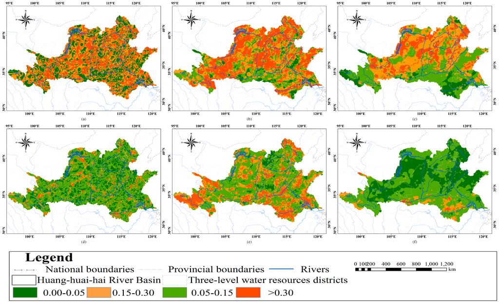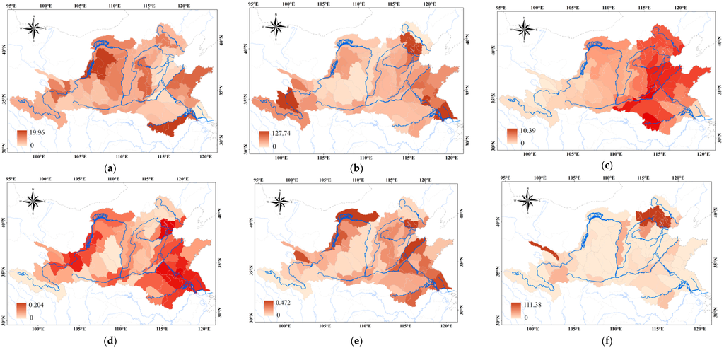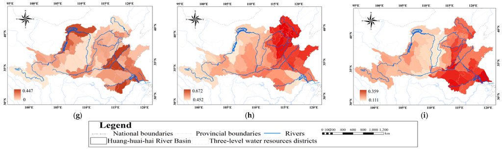 According to the above calculation methods, in Table 3 and Figure 9a–i, we can obtain the density or ability of water conservancy projects in each district. The mean value of each density or capability in the Huang-Huai-Hai River Basin is shown in Table 3, as well as the maximum and minimum values.