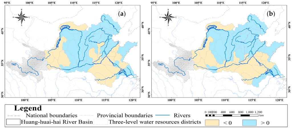 The reason why the two ratios of statistical droughts decrease faster than those of meteorological droughts is that the construction of water conservation projects relieve the drought to a certain degree. The difference between the RDAA and RDSA of meteorological droughts and those of statistical droughts can reflect the drought coping ability in this region. If the difference is positive, the projects play a positive part in enhancing the drought coping ability; otherwise, they do not. As shown in Figure 8, excluding the districts where real data are absent, the water conservation projects in the Hai River Basin and eastern Yellow River Basin play a significant role in promoting the drought coping ability. The projects in the Huai River Basin play a relatively weak role.