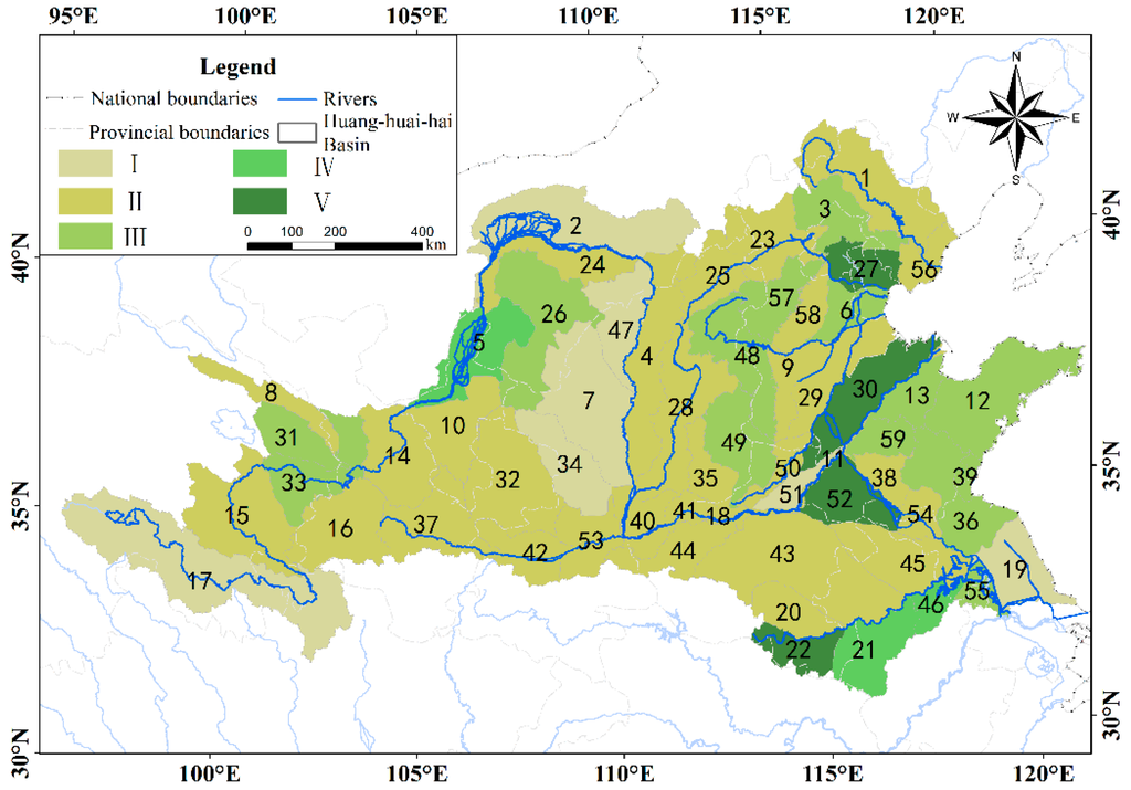 The Huang-Huai-Hai River Basin consists of three important basins of China: the Yellow River Basin (eight of the two-level water resources districts and 19 of the three-level water resources districts), the Huai River Basin (five of the two-level water resources districts and 15 of the three-level water resources districts) and the Hai River Basin (four of the two-level water resources districts, 15 of the three-level water resources districts). The hierarchy of water resources districts is governed by the Ministry of Water Resources of the People’s Republic of China according to the watershed system and administrative division.